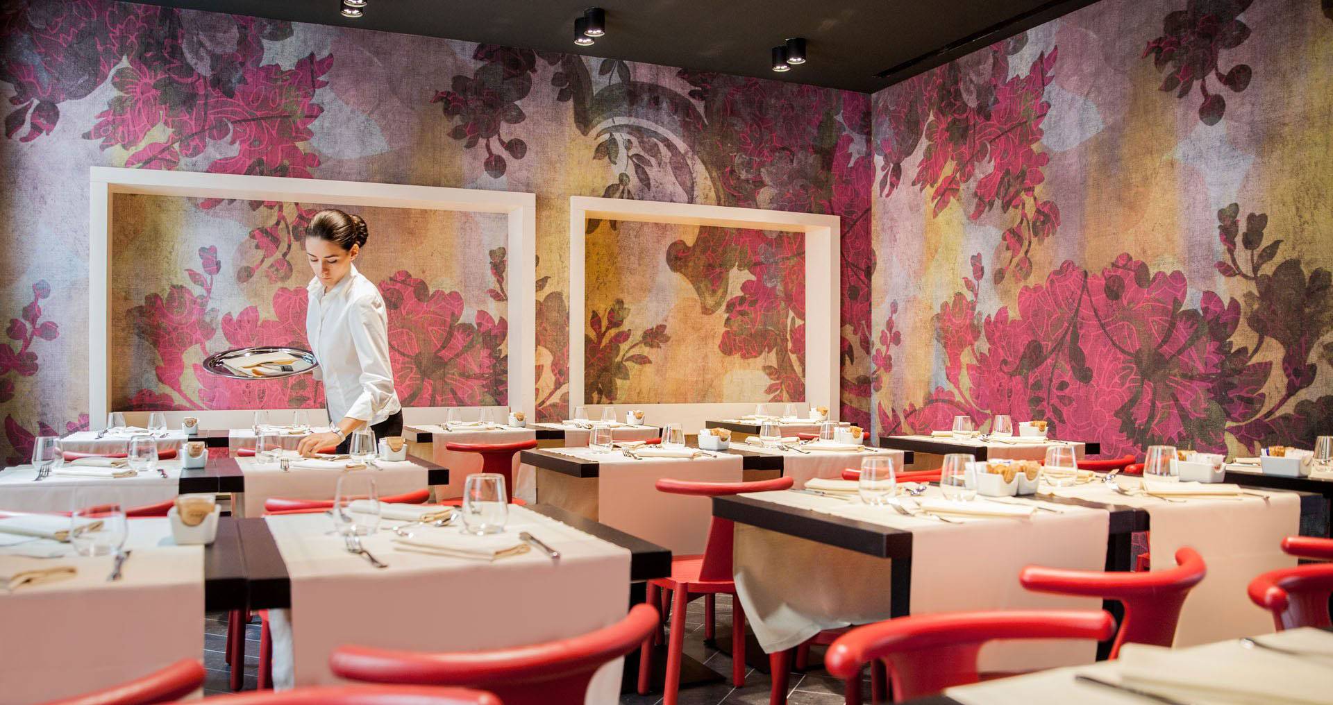 On the mezzanine, the restaurant rooms are connoted by three different subjects: “Venice Glam” for the dining room, “Victoriya” for Gourmet room, “Poppies” for the breakfast room.